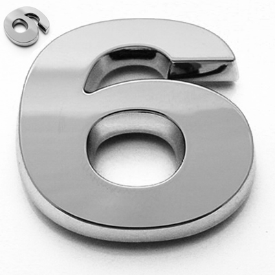Ziffer 6, Kunststoff, galvanisch verchromt, ca. 27x25x3mm Breite x Höhe x Stärke (+0,8mm Klebefilm) Material: ABS